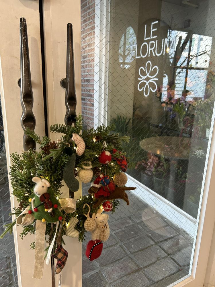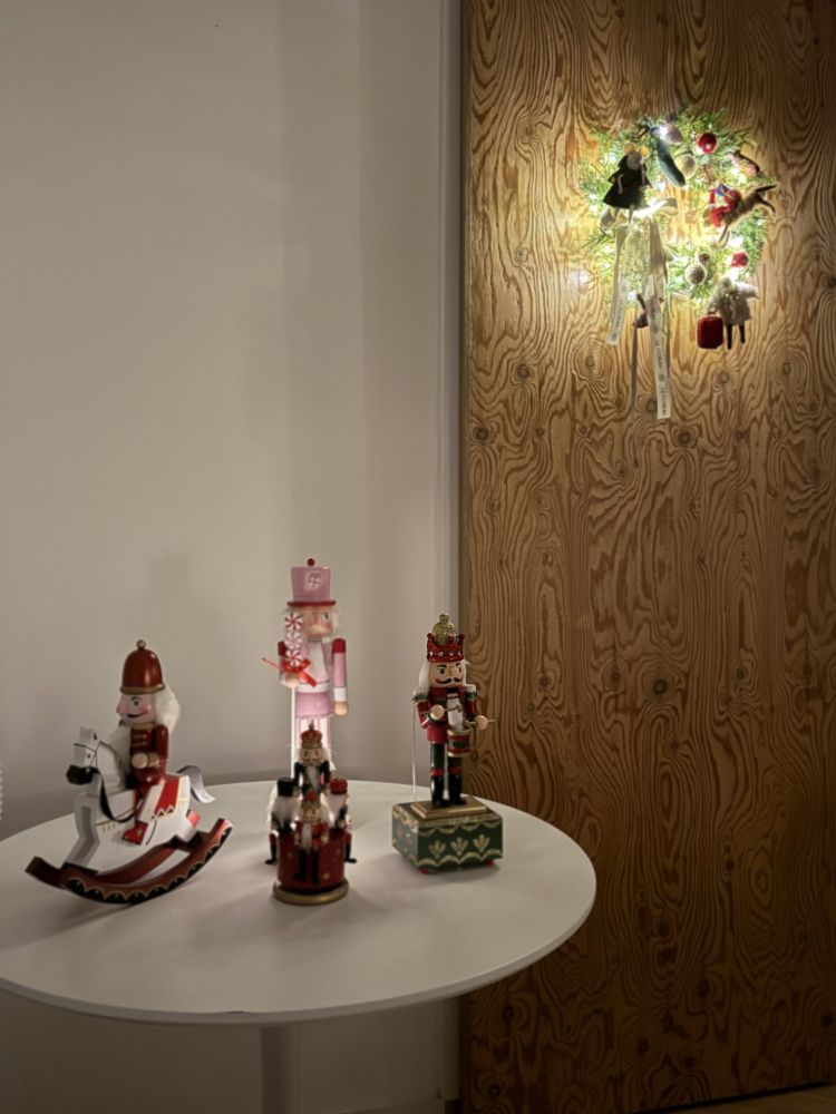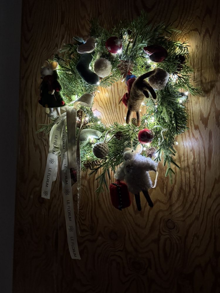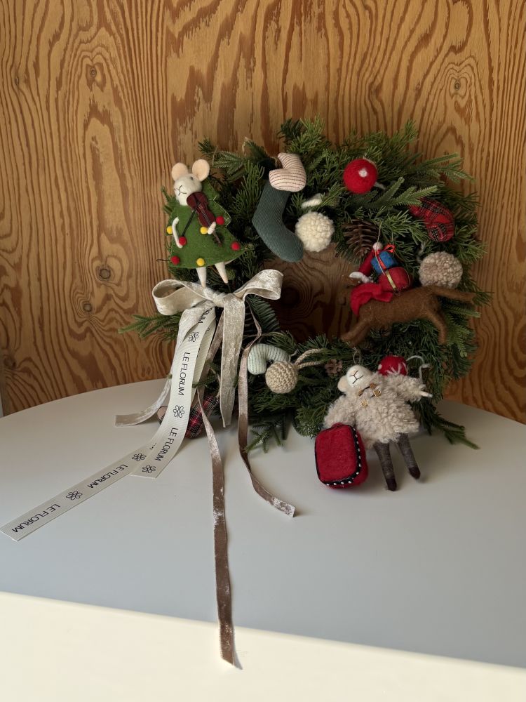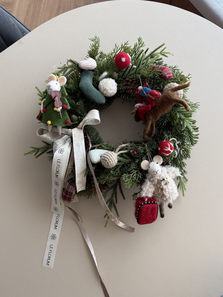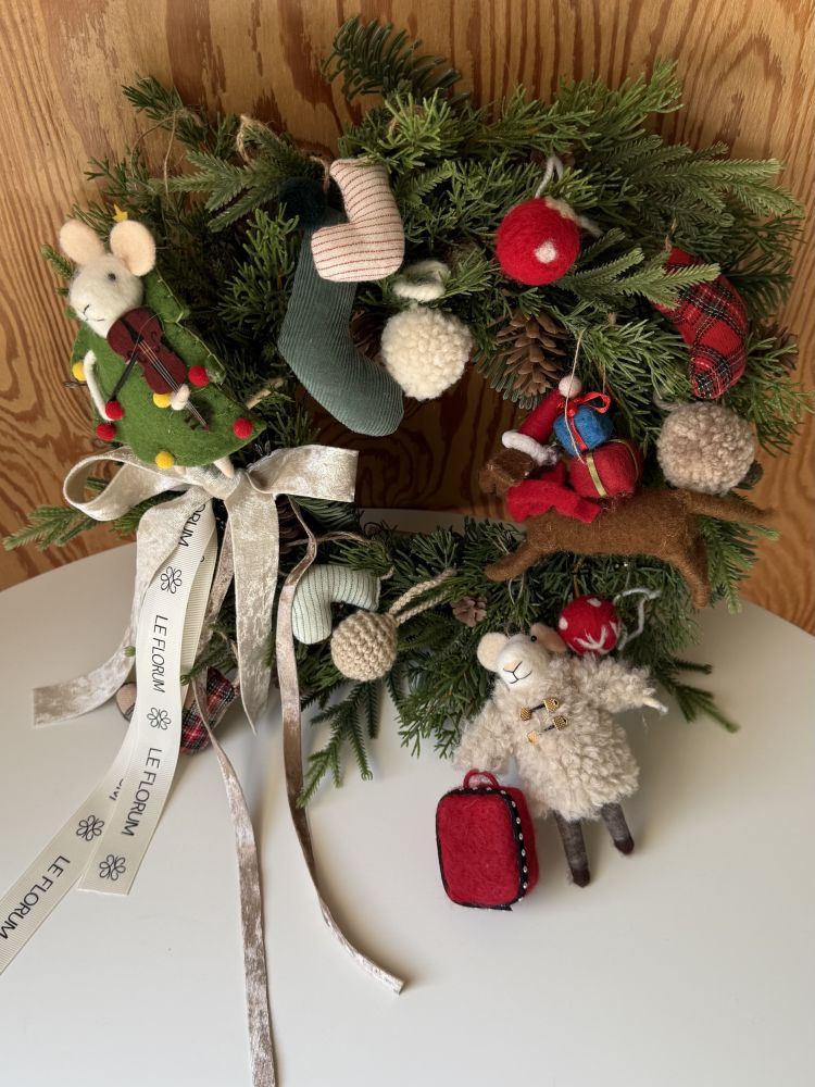 그리고 3가지 모양의 인형 오너먼트들로 만들어진 리스